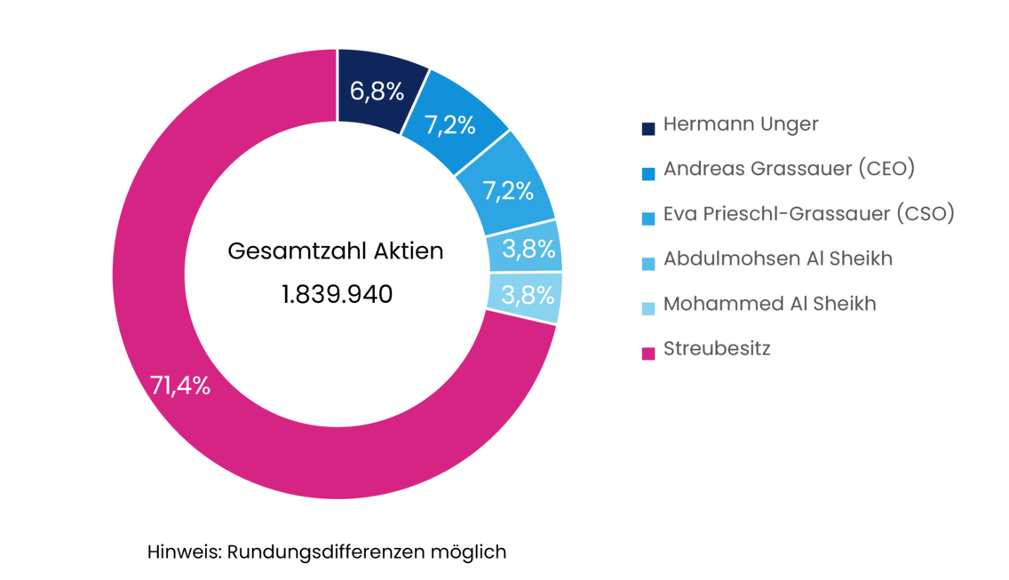 Die Aktionärsstruktur von Marinomed stellt sich aktuell wie folgt dar: Kernaktionäre sind mit rund 25 % der Anteile (davon ca. 2 % im Streubesitz) die Gründer und das Management von Marinomed. Die Aktien des langfristigen Investors Acropora Beteiligungs GmbH in Liquidation wurden zu gleichen Teilen durch deren Gesellschafter übernommen (gemäß Meldungen vom 30. Mai 2023). Der Streubesitz liegt bei rund 70 % der Aktien.